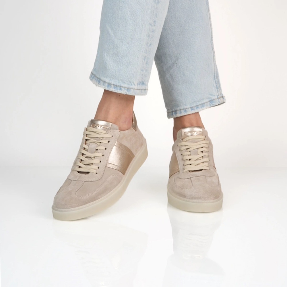 A bézs színű Delila sneaker egy letisztult, kényelmes darab. Hasított bőr felsőrészét csillogó részletekkel láttuk el, így könnyen kombinálható nőies és sportos összeállítással egyaránt. Könnyű és rugalmas kialakításának köszönhetően maximális kényelmet nyújt, miközben divatos megjelenést kölcsönöz. A cserélhető talpbetétnek köszönhetően akár saját egyedi stílusodnak megfelelően is alakíthatod a kényelmet – egyedi talpbetét választásával.