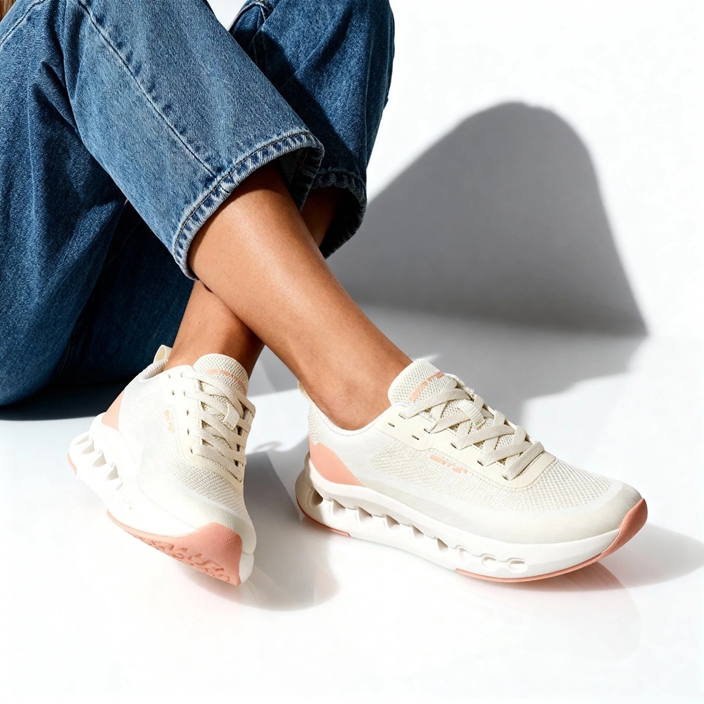 Megjelenésében a letisztult fehér és finom barackszín kombinációja nőies, mégis sportosan lendületes hatást kelt. A fehér fűző harmonikusan illeszkedik az összképbe, míg a cipő dinamikus vonalvezetése modern, energikus karaktert ad.