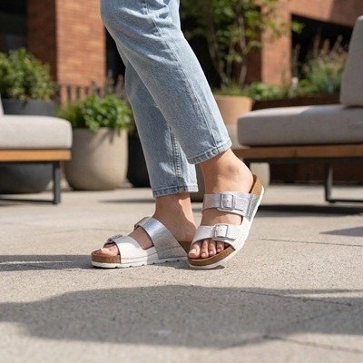A két állítható pánt és az ezüstszínű csatok gondoskodnak a kényelmes, személyre szabott illeszkedésről. A könnyű, rugalmas, parafa hatású talp puha alátámasztást ad, így ideális választás a mindennapokra – akár városi sétához, akár otthoni pihenéshez.