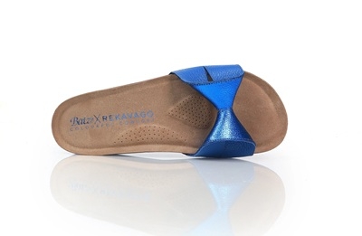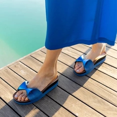 A Pretty Geisha Blue papucs egy újragondolt modell, mely a kék szín eleganciáját ötvözi a prémium kényelemmel, s mindezt emelt talpon, mely modern megjelenést és extra stabilitást biztosít. A talp alsó része mélykék, felső rétege pedig fekete, így természetes és kifinomult összhatást teremt.