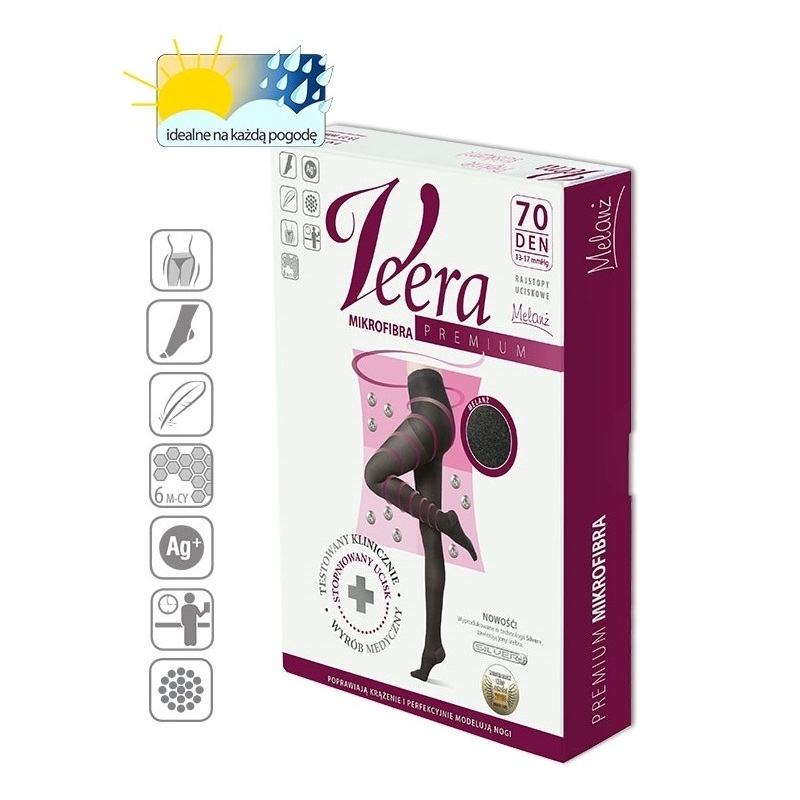 A Veera Premium termékcsaládja egy igen magas minőségű orvostechnikai eszköz, melyet elsősorban megelőzésre, illetve a vénás érelváltozások első tüneteinek kezelésére ajánlunk. A Veera termékek gondosan kalibrált, fokozatos kompresszióval javítják a vérkeringést, csökkentik a duzzanatot és az elnehezült láb érzetét. Klinikailag tesztelt, tar tós, finom tapintású anyagból készültek, melyeket a Silver+ ezüst-ion technológia tesz még hatékonyabbá és különlegesebbé.