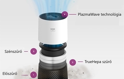 • 4 lépcsős levegőtisztítás: MESH előszűrő a porrészecskéknek, szénszűrő, 99.97%-os TrueHEPA szűrő és WINIX PlasmaWave® levegőtisztítási technológia